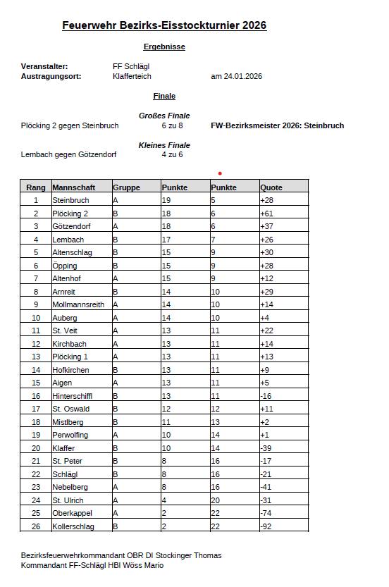 Bei eisigen Temperaturen aber herrlichem Winterwetter ging am Samstag, den 24. Jänner 2026 am Badesee Klaffer, erstmals wieder nach siebenjähriger Pause, die Feuerwehr Bezirksmeisterschaft im Eisstockschießen über die Bühne.