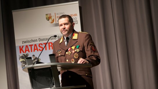 Bezirks-Feuerwehrkommandant Oberbrandrat Thomas Stockinger dankte den Anwesenden Kameradinnen und Kameraden und schloss die Bezirkstagung 2025 mit dem Leitspruch der Feuerwehr “Gott zur Ehr, dem nächsten zur Wehr”.