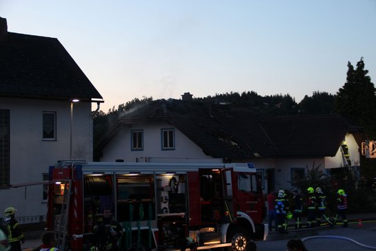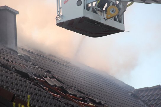 Mittels Drehleiter wurde ein erster Außenangriff vorgenommen, wobei noch nicht ausgemacht werden konnte, wo genau sich das Feuer im Dachstuhl befand. Zu diesem Zeitpunkt trat nur wenig Rauch aus dem Dach hervor. Was aber feststand, war, dass es kleinere Explosionen gegeben haben dürfte, denn manche Dachziegel waren "angehoben" bzw. wießen Sprünge auf, so Einsatzleiter Martin Wakolbinger.
