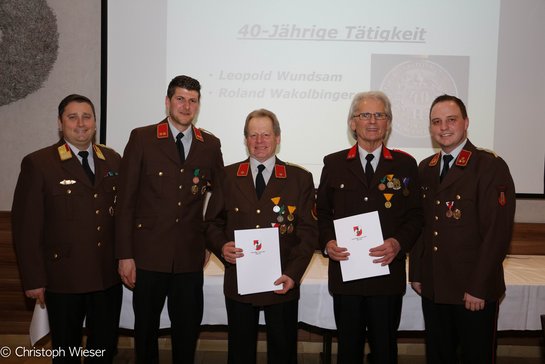 Als nächster Punkt standen Angelobungen und Beförderungen an der Tagesordnung, besonders hervorzuheben ist die Dienstmedaille für 40jährige Tätigkeit in der FF Neustift von Leopold Wundsam und Roland Wakolbinger.