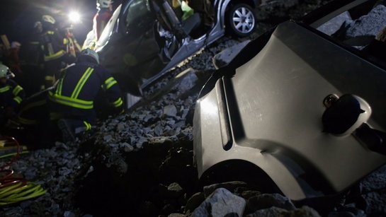Hinweis: Die in dieser Übung beteiligten Verletzten stellen lediglich verunfallte Personen dar und wurden für diese Übung eigens geschminkt/verkleidet, um für die Einsatzkräfte ein reales Szenario zu erwirken.