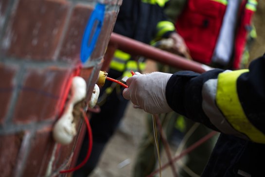 Nachdem die Zünder miteinander verkabelt wurden, ist noch eine abschließende Prüfung der Leitungen mit einem Ohmmeter durchgeführt worden. Der Bereich der Sprengladungen wurde mit Strohballen, Vlies und Holzlatten abgedeckt, um durch die Explosion herumfliegende Teile abzuschwächen.