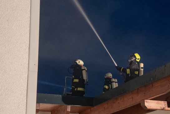 Beim Eintreffen der ersten Feuerwehren stand der Dachstuhl bereits in Vollbrand. Mehrere Atemschutztrupps übernahmen die Brandbekämpfung im Innen- sowie Außenangriff.